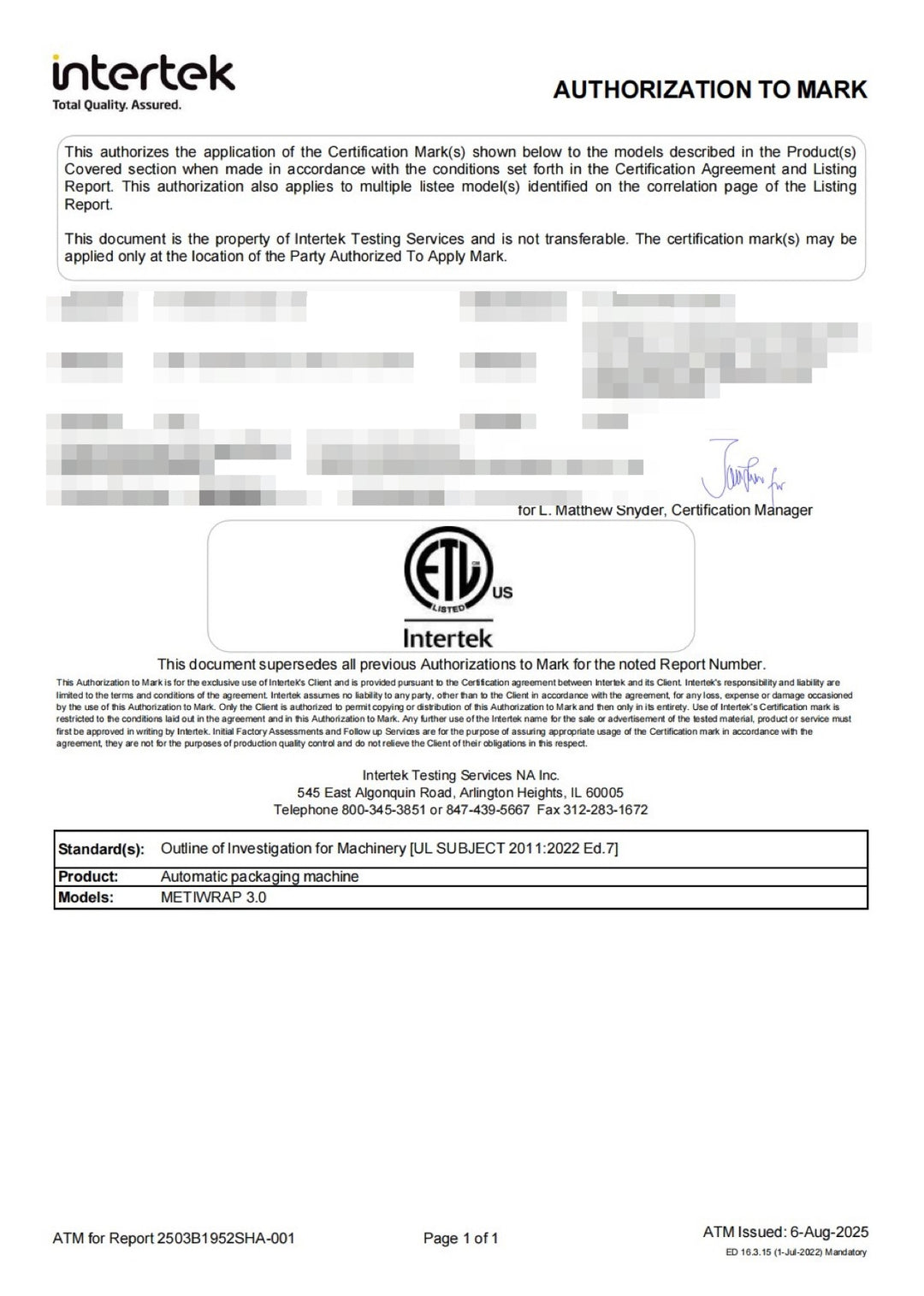 ALL METIS machines are fully ETL certified to meet OSHA-compliant safety and performance standards for industrial equipment in North America.